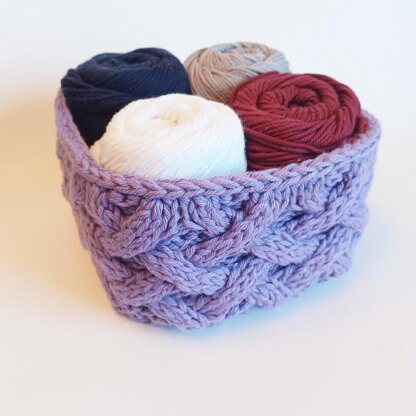 The square seed stitch base (worked flat) provides a solid foundation for the bowl; stitches are picked up from the base, and the cable pattern works upward in-the-round to the I-cord bound off top rim.