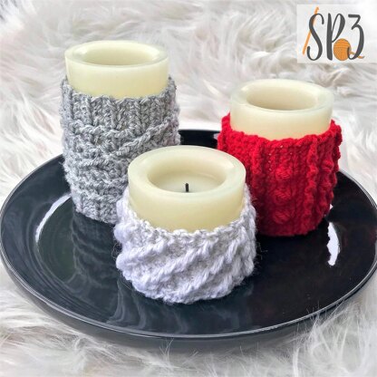 Important Note: Only use wickless and/or flameless candles when using the cable candle wraps. Open flames and yarn do not mix and can be very dangerous. The candle wraps are designed to fit around a 3” candle in varying heights of 3”, 4” and 5”. The wraps are made as a flat piece, as shown in the detail photos, but then stitched together to form the wrap. They are versatile and fun, use any color combination, to add to your holiday decor.