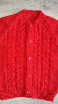 The cardigan has simple cabling and diamond patterened panels, with raglan shaping. The welt , cuffs and neckline are knittedin a 1 x1 rib