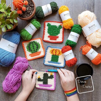 Add a little whimsy to your home decor with the fun and easy Cactus Coaster Quartet. These four patterns all have fun and personality all their own but there’s still a lot of room for you to customize. And with the graphs available on Divine Debris, you can even turn these cut coasters into cute blanket with just a change to c2c from tapestry/intarisa.