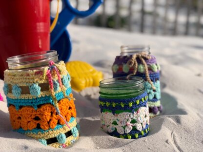 The Calypso Crab Cotton Jar Huggers pattern was designed as part of the 2018 Mermaid CAL. The pattern includes both Quart and Pint-sized patterns. The quart jar pattern features not only the Calypso Crab stitch, but also bobbles to represent small seashells. The pint hugger focuses mainly on the Calypso Crab stitch.