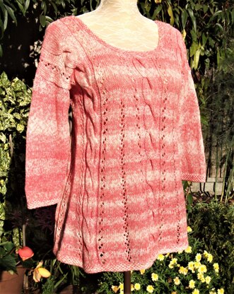 A pretty combination of eyelet-lace patterning and cables makes this both interesting to make for the knitter, but also beautiful to wear - with just the right amount of shaping to make this almost floaty and not clingy. Sleeves are in stocking stitch and all edgings are in a pretty slip-stitch patterning.