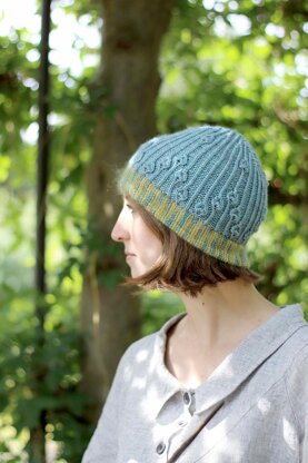 The brim is knitted in the round and turned inside out to flatter pretty handpainted yarns. Stitches are picked up to form the body of the hat and the twisted stitch pattern leads to a star-patterned crown.