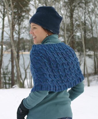 "Cambia" is Italian for "it changes," which perfectly describes this capelet: it can be worn over both shoulders, or just one shoulder, or even as a short skirt over tights, leggings or jeans. In addition, the "wrong" side of the cable stitch pattern is very attractive, meaning that you can decide to make it the "right" side, or even wear it with either side facing out, as the mood strikes you!