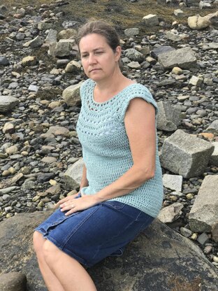 The Camden Summer Top crochet pattern creates a lovey sweater top with lovey stitch work around the neckline and capped sleeves.