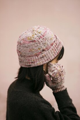 The hat features a fancy folded brim, that you can knit in a 2x2 or 1x1 rib to match the style of your mittens. The crown is particularly lovely, but you can add a pompom for fun and it will look equally sweet.