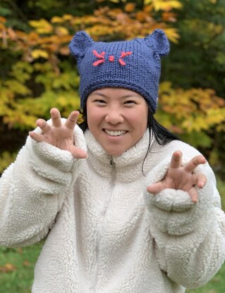 Sorry, I couldn’t help myself on the name choice, but yes, you can make these ears, knit as part of the main hat. I’ve long wanted to make a simple-to-knit hat with ears. It took me years but I am finally happy with the results. So QUICK to knit in a soft, bulky wool. The ears are easy, not fussy, no short rows but still a professional look. One evening session and you are done! Ears can be “pinched” with a single sewing stitch or left flat. Ears can be lengthened as well. All simple to do. Facial features are OPTIONAL. See last page for photos without embroidery.