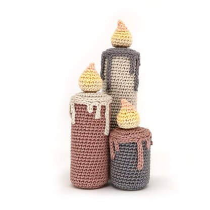 MEASUREMENTS With the yarns used in this project, the candles measure: small candle: 10 cm tall, 4.5 cm wide medium candle: 15 cm tall, 4.5 cm wide big candle: 20 cm tall, 4.5 cm wide