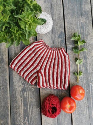 Candy Cane Christmas shorts are red & white striped bloomers, perfect for styling kid's festive outfit. These rib texture pants are crocheted in one piece, joined as you go, changing the main and contrasting yarn colors in rows indicated.