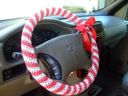 Stripes are crocheted at an angle so that it really looks like the stripes of a candy cane. Add a pretty bow and voila your steering wheel is ready for that Christmas shopping!