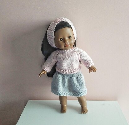 This is a pattern for a cloth set for a 36 cm doll. It is made of a jumper, either worn as a cardigan or a sweater, a skirt and a headband. The top is knitted in one piece top down. Happy knitting!