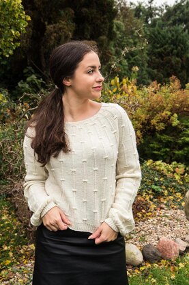 The pullover is completely worked inside out to avoid purling too many stitches. A helpful video tutorial explains the special technique used to create the decorative welts sitting like notes on staff lines in music.