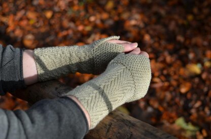 Caol is a pair of elegant slimming wrist warmers or cuffs. It incorporates a herringbone pattern on the wrist (knit in the round) and a garter stitch hand cuff which is worked back and forth and has an overlap through which your thumb can emerge.