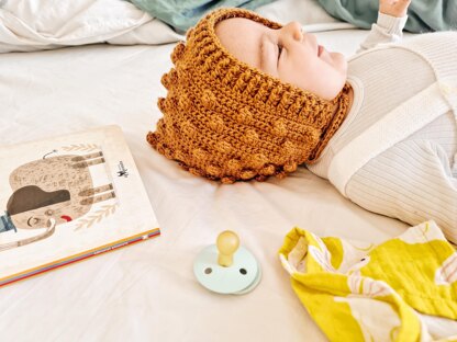 This bonnet style hat is simply adorable. It is a warm accessory, simple to make, and with a vintage touch that brings a lot of style to the little ones. It is constructed in a single piece, from a rectangle that combines plain rows of single crochet and others with popcorn stitch.