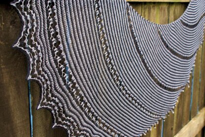 Caprice is worked from tip to the lace edging. Simple garter stitch stripes are blended with crossed stitches and simple lace to create a shawl that’s fun to knit and wear.