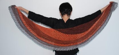 The shawl consists of three sections: Garter stitch, lace and short rows in all sections. All RS rows will begin and end with two increases (kfb), and all RS short rows begin with two increases (kfb), thus creating a semicircular shape. The shawl is finished with a picot bind off.