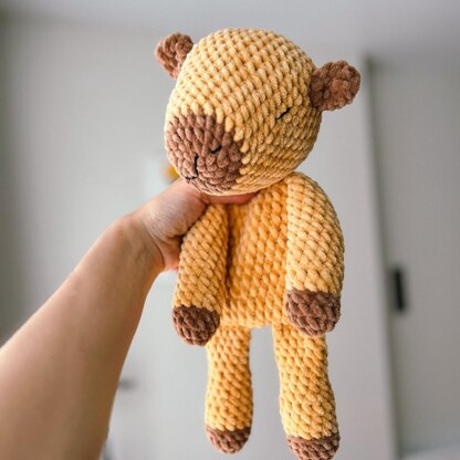 Capybara snuggler is perferct for small hands. LOW-SEW plushie capybara snuggler The measures approx. 13.4 inches (34cm), final measures will vary, depends on the yarn you use. This capybara snuggler can be a great handmade gift idea for a baby shower or newborn baby or just a kid.