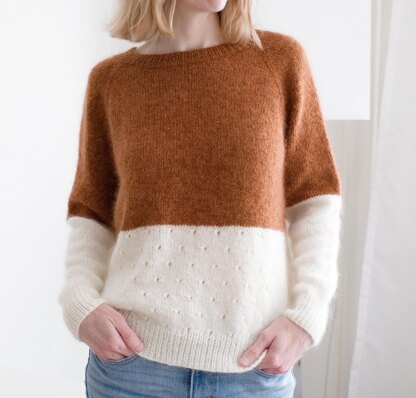 Caramel Vanilla is a relaxed, raglan sleeved sweater with simple Eyelet pattern on lower body. It’s worked from top down and requires minimal finishing. The work begins with the neck ribbing. The neckline is then shaped with short rows. When the raglan increases are completed, sleeve stitches are placed on hold and the body is worked in the round towards the hem. Sleeve stitches are then placed back on needles and the sleeves are worked in the round towards the cuffs. The pattern includes a photo tutorial for German short rows. The Eyelet pattern is both charted and fully written out. One strand of Arwetta and one strand of Silk Mohair are held together throughout the project.