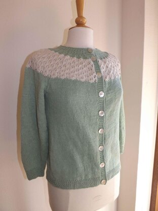Cardigan Blues Girl is a child size version of "Cardigan Blues". Cardigan blues girl is a cardigan knitted back and forth from the bottom edge and up with a round yoke and unusual rib edges at the bottom of the body and sleeves. The yoke has a very nice lace pattern worked in a contrast color (or main color). The pattern is made for at yarn with a gauge of 27 stitches per 10 centimeters - i.e. a yardage op approximately 175-180 meters per 50 grams.
