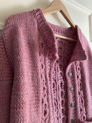 GARMENT CONSTRUCTION: The cardigan is worked from the bottom up in one piece to underarm, then front and back are knitted separately to the shoulders and joined together with a 3-needle bind off. Stitches are picked up for the sleeves and shaped with short rows. The cardigan is finished off with a buttonband and a collar.