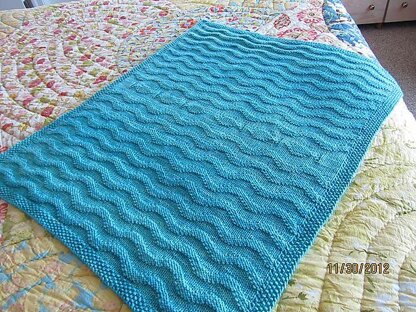Description: The color of this yarn so reminded me of the waters of the Caribbean that I had to make a blanket to evoke this image. A row of fish swims through the middle of a sea of waves in this symmetrical and nearly reversible baby blanket.
