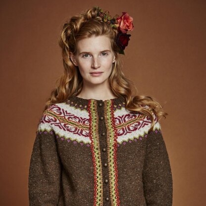 CARMINE – this is one my personal favourites, it’s a yoke cardigan, knitted in the round and steeked. I’ve edged the button bands with a multi coloured crochet trim, which I feel, finishes the garment really well. The back of the steek is covered with a woven ribbon. The yarn is Rowan Felted Tweed.