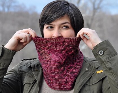 Closed-loop cables and garter stitch combine to make this super squishy and warm cowl, perfect for snuggling into on a cold winter’s day. The cowl is designed to be slightly cone-shaped, allowing it to expand nicely around the base of your neck while still keeping a close fit around your face.