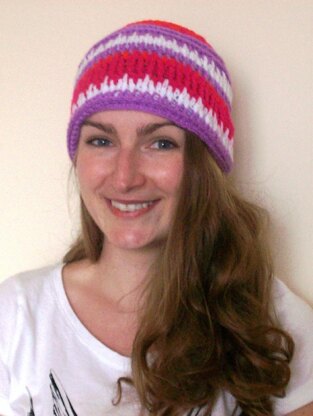 Finished Size/Gauge: Finished size goes from 21 inches/53 cms unstretched to 24 inches/61 cms stretched, approximately, and will fit the majority of teenager and adult heads. Gauge is not critical because of the ‘stretch factor’ if you would like a particularly large diameter hat then go up a hook size or two, bearing in mind that more yarn will be required. The length is easily adjusted by repeating the rounds 28 and 29.