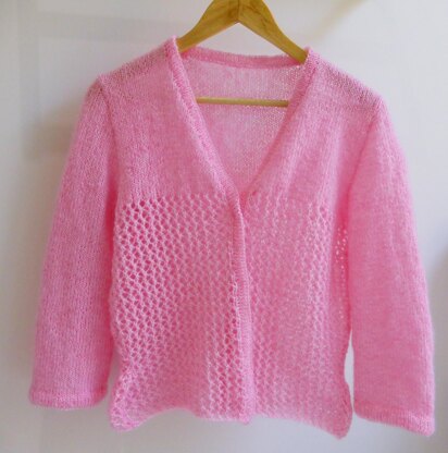 This ladies plus size V neck Jacket has optional waist shaping and ¾ length, set-in sleeves. The bodice and sleeves are worked in easy stocking stitch while the lower body features a lovely lace pattern.