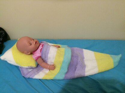 A lovely Caron Cake Cocoon Baby Blanket and Pillow, size is for newborn up to 6 months, depending on how fast the baby grows, can last up to a year in sizing, would make a lovely gift and is just so cute, soft and warm, pattern comes with both the patterns for the Cocoon baby blanket and the pillow, with tips on how to sew it up and such.