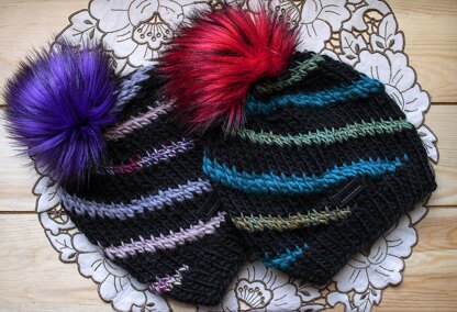 The colorwork for Carousel is done a bit differently, combining elements from two different techniques, Fair Isle and Instarsia. The instructions have been written for 3 contrast colors to be incorporated into the stripes, each used twice, but this hat can be made with 1, 2, or 6 contrast colors, as well.