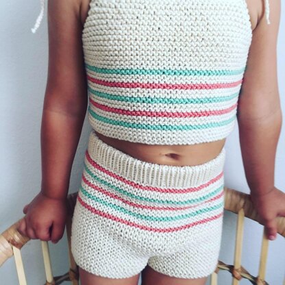 - A basic SHORT made in garter stitch, with color stripes on front and back. It is work individually at first (legs) on flat needles, then all together on flat needles, leaving just one seam at rear side.
