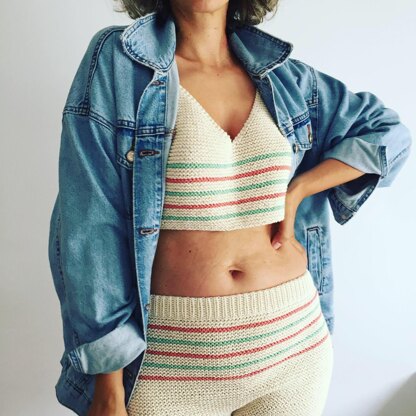 - A basic SHORT made in garter stitch, with color stripes on front and back. It is work individually at first (legs) on flat needles, then all together on flat needles, leaving just one seam at rear side.