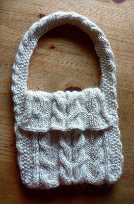 This cute holder of treasures is a great way to master stitch-exchange, or cables. Worked in two pieces - the main body of the bag first (a flat piece of fabric) and then the cable stitch strap - which is added on after the main piece if complete.