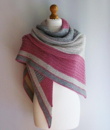 Roslyn from Cascade is a lovely blend of wool and silk in a DK weight. The silk takes the dye differently than the wool, creating soft and subtle flecks of color. Garter stitch triangles, stocking stitch panels with garter ridges and a garter stitch border make up this triangular sideways worked shawl. You will need to increase into the front and back of a stitch and make one both left and right. The pattern slips the first stitch and purls the last stitch of each row, making it very easy to pick up stitches for the border.