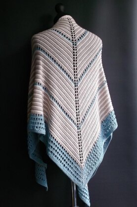 This top down shawl uses Cascade’s “Anchor Bay” yarn. Anchor Bay is a wool and cotton mix, which makes a lightweight shawl with beautiful drape. Garter stitch stripes and a simple eyelet pattern, a great TV/beginner knit.