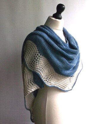 This shawl starts out as a basic boomerang shape worked in garter stitch. Then stitches are picked up down one side to work a modified feather and fan border.