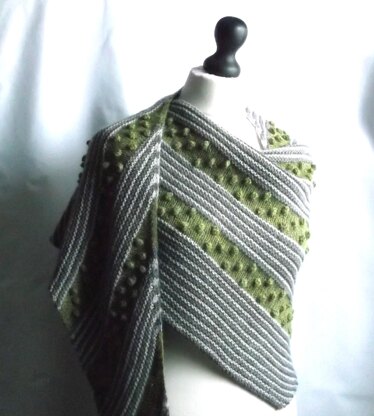 This boomerang shaped shawl has bobbles and garter stitch stripes and is knit in a lovely soft yarn in three shades.