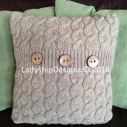 The 16"/40cm square cushion cover uses a repeating pattern of a simple rope cables. I knit it using a medium/aran/worsted/#4 pure wool yarn. The envelope closure allows for easy removal to change your décor or for washing and I chose coconut buttons to add another element of visual interest.