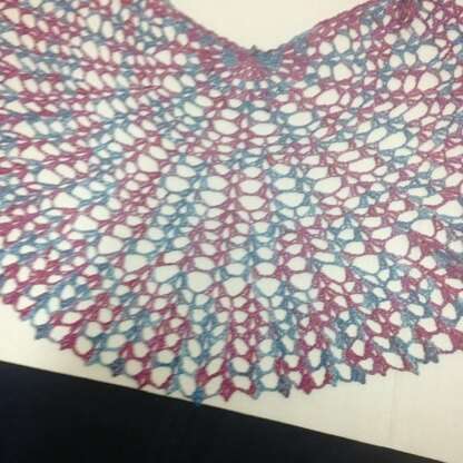 Finished shawl is about 44" wide x 24" deep. You could use any sport weight yarn you prefer. Using Interlacements Zig Zag, I had just enough with one skein. This shawl has an easy to make lacy design.