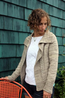 A reversible collar can be folded back or draped inward and looks great either way. The casual shape can be pinned closed or worn open, and the length is easy to adjust. Simple lace on the front and back makes a flattering line and adds a little interest. Knit from the top down with minimal shaping and no seams, Cassis is a cardigan that’s easy to knit AND wear. This pattern contains instructions for both Worsted and Aran weight yarn, short or long sleeves, and options for hip or long length.