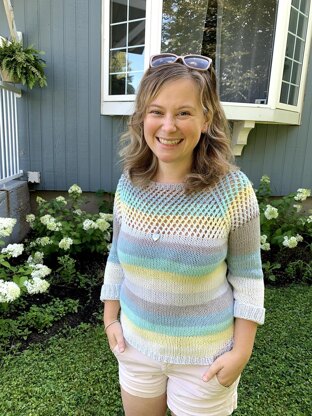 A raglan pullover with optional cap sleeves or full sleeves. The comfortable cotton and summery colour scheme demanded a light and breezy design. The mesh stitch reminds me of a fishing net and is super breathable and light. In my sample, I switch from open mesh to stockinette a little bit higher in the front than the back and sleeves - this can be done at any point to have more or less coverage over the décolletage. The drape of the cotton hugs the body in 0-2" / 0-5 cm of positive ease, but would also be chic and comfy as an oversized sweater with 4" / 10 cm of ease or more.