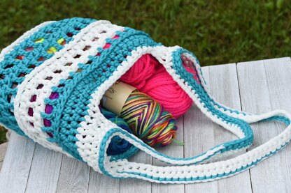 Materials: 12 mm hook Bernat Maker Outdoor Yarn or Any Bulky weight yarn (5) Approxiately 230 yards Large Eye Tapestry Needle Finished Measurements 12 ½ inches wide and 21 inches tall including straps, without straps 15 inches tall.