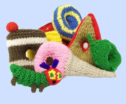 THE FOOD INCLUDES: APPLE, PLUM, PEAR, ORANGE, STRAWBERRY, CHOCOLATE CAKE, ICE CREAM, PICKLE, CHEESE, SALAMI, LOLLIPOP, CHERRY PIE, SAUSAGE, CUP CAKE AND WATERMELON PLUS THE LEAF. THE FOOD IS ALL KNIT WITH HOLES FOR THE BABY CATERPILLAR TO EAT THROUGH.