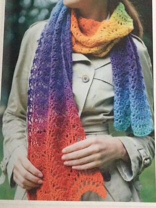This pretty scarf uses a traditional feather and fan lace stitch to great effect, causing the variegated yarn to form stunning zigzag stripes as you work, with minimal effort. options; •use two different kinds of variegated yarn with long-colour repeats, or choose one solid-colour yarn and mix it with variegated yarn with long-colour repeats.