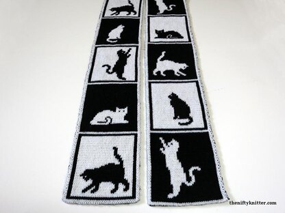 Perfect for any cat lover, the Cats in Boxes Scarf features cats being cats — playing, sitting, resting. Each box contains a different cat with alternating colors for emphasis.