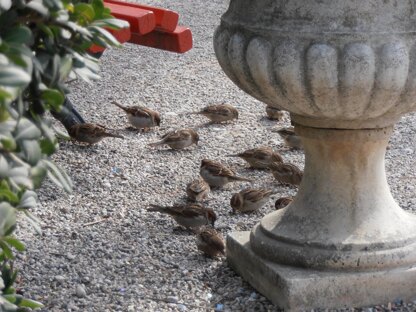 The socks feature a column of symbolized birds in flight on the leg and heel flap with a single feather on the foot. The column spirals around the leg with the remainder of the leg worked in ribbing. The foot is worked in stockinette.