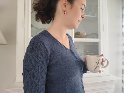 Céanothe is a V-neck cardigan that is knitted top down and without seams. Its original construction (saddle shoulders) and its delicate lace on the sleeves make it a classic model but so addictive to knit.