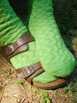 These socks are knit from the toe up, using a short-row garter stitch heel and toe construction. The subtle zigzag pattern on the top of the foot and leg is perfect for semi-solid sock yarns.