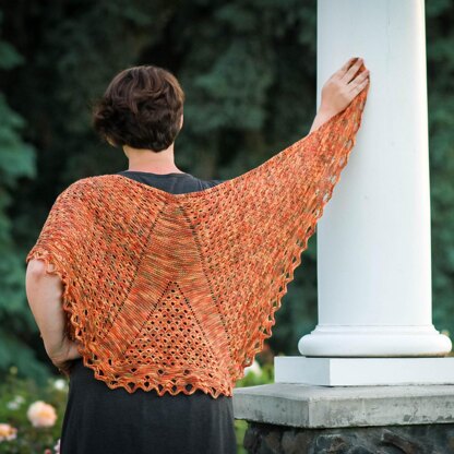 *A unique top down shawl inspired by the movement of light through our celestial heavens, triangular sections of slipped stitches are like swatches of starbursts reaching across the galaxy. A vertical column of garter stitches branches apart to make way for a comet of movement and the final border has 3 rows of falling stars. *